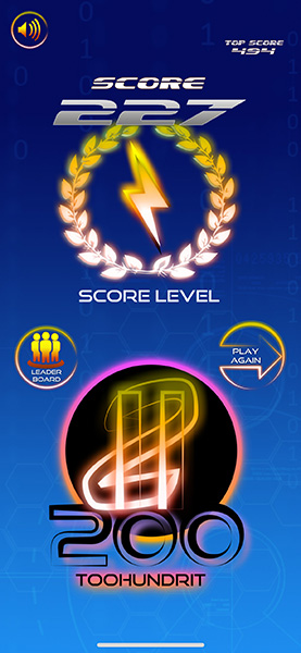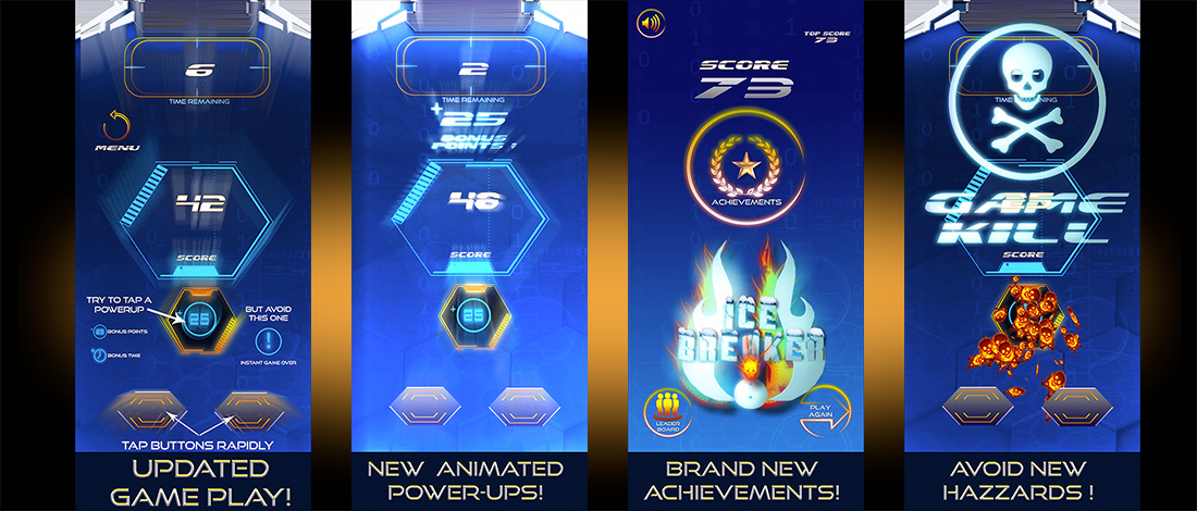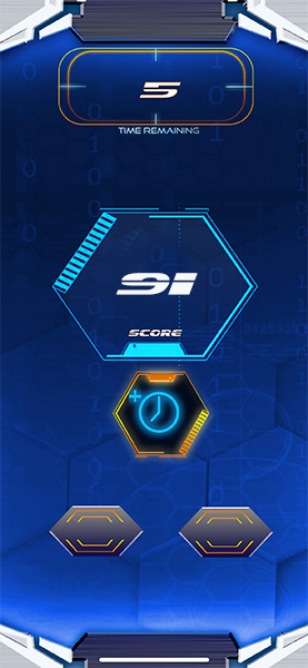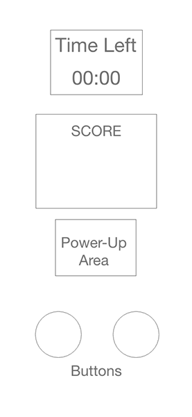 As feedback was gathered and analyzed, below you can see the addition of connectivity to an online leaderboard instead of just a local high score on the device. Also, prototype testing revealed feedback that "power-ups" might add to the game if there was an element of risk. There is now a UI element that rapidly displays power-ups for .25 second each. One of the items is actual a "Game Kill" element. If hit, this will immediately terminate the game and freeze your score. Lastly, Achievement Badges have been added based on score level.