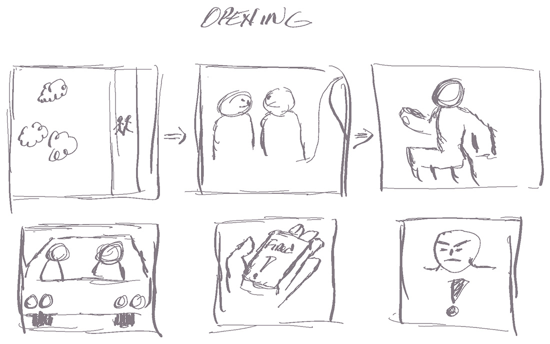 The development of the concept was based on initial sketches that would ultimately help work out the sequencing of the story into two halfs..